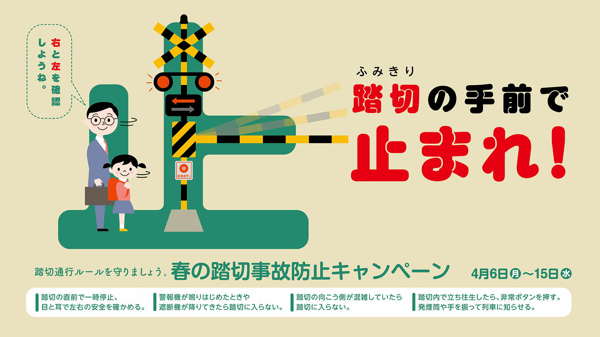 JR東海では、4月6日(月)から4月15日(水)の間、春の全国交通安全運動に合わせて、春の踏切事故防止キャンペーンを実施しております。 警報機が鳴っているときや、遮断機が閉じようとしているときは踏切の中に絶対に入らないでください。また、自動車で通行する場合には、踏切の手前での一時停止と前方のスペースを確認してから通行してください。 踏切事故防止にご協力をお願いいたします。