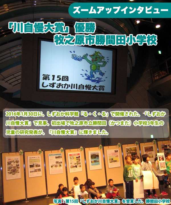 発表が終わり、次の発表成果が出るたびに、彼らは次第に自信が薄れ意気消沈しかけていましたが、全員の発表が終わり、参加者全員によるそれぞれの賞への投票がありました。投票結果が次々に発表され、最後になっても名前を呼ばれず半ばあきらめかけていると、「最後に、川自慢大賞に輝いたのは、勝間田川にはウナギがいるよ、を発表した勝間田小学校のメンバーです」の発表。彼らはその発表が聞えた途端歓声を上げ、会場の拍手とともに壇上にかけ上がり、全員で表彰を受け、賞状と大賞カップ、それに副賞として大きな箱に入ったクッキーをいただきました。