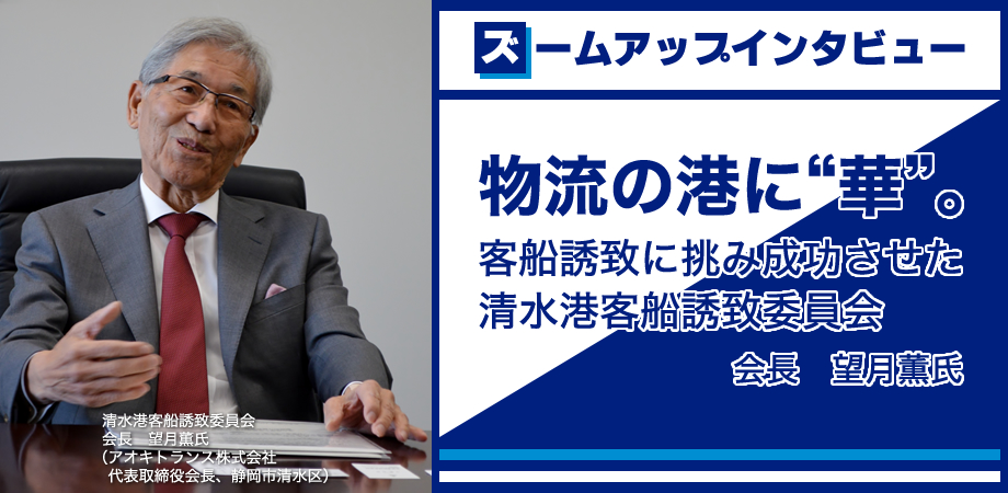 清水港客船誘致委員会を立ち上げ、現在も会長を務めている望月薫氏(アオキトランス株式会社代表取締役会長、静岡市清水区)に、誘致を始めたきっかけや、ご苦労、港の整備に望むこと、今後の清水港の在り方などをお聞きしました。