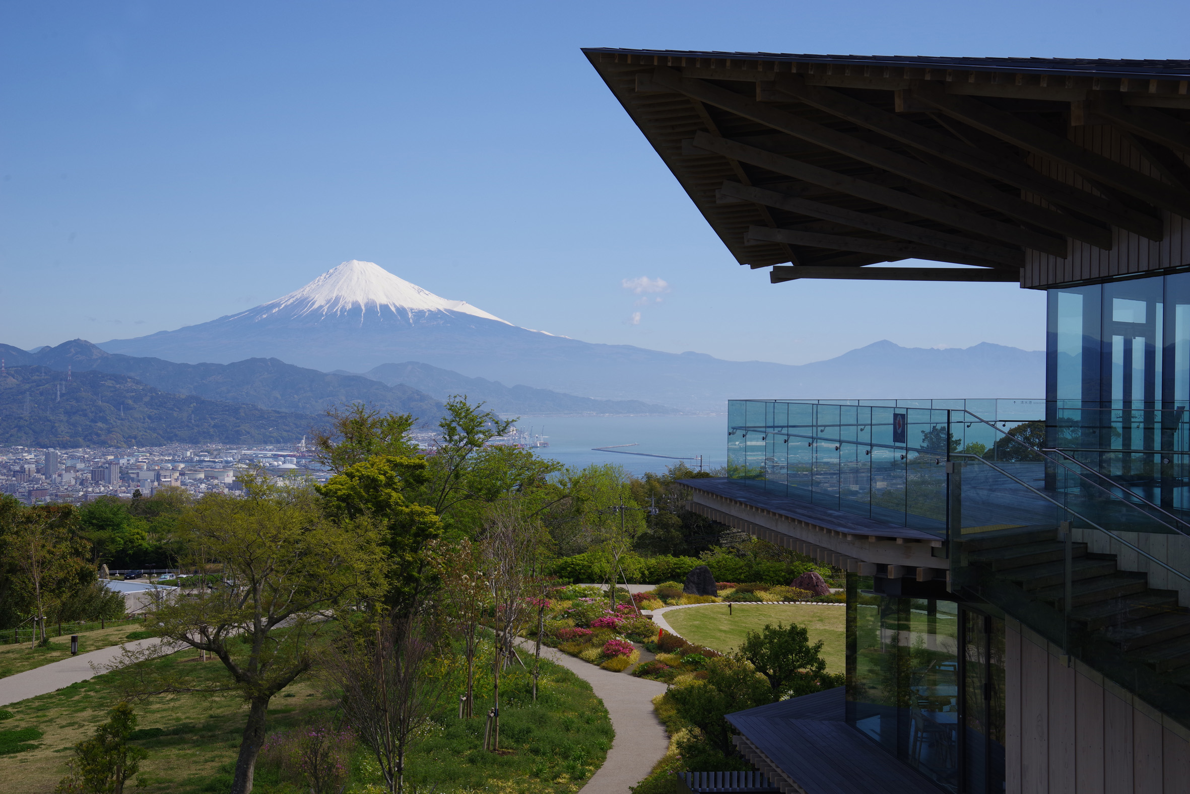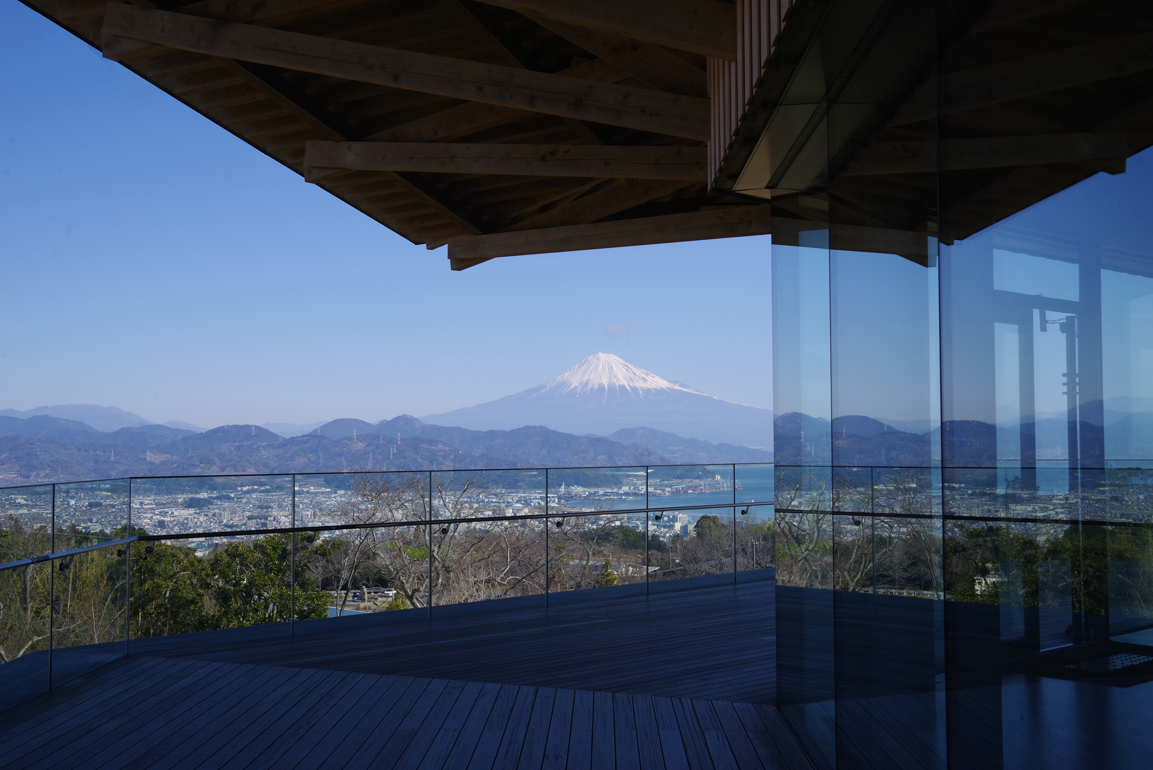 日本平から仰ぎ見る富士山、右の建物が夢テラス 日本平夢テラスからの富士山