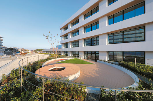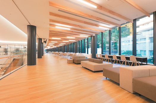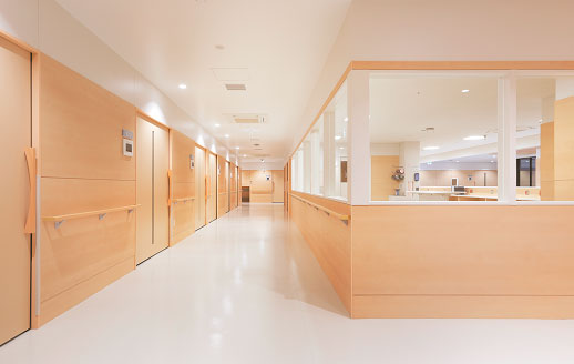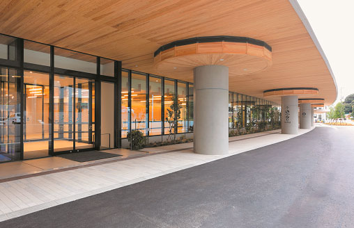 施設は実施設計の段階から施工者と技術協力を結び、施工面での工夫や特殊技術など、施工者のノウハウを実施設計に反映するECI方式を採用。正面玄関をはじめ建物内部は地場産材の天竜杉を多用し、清潔で温かみあふれる空間とした他、自然光が差し込む大きな窓を採用し明るい空間になるよう工夫されています。4階にある小児病棟からは空中庭園に出ることができ、患者と職員がリラックスできる環境を整えました。