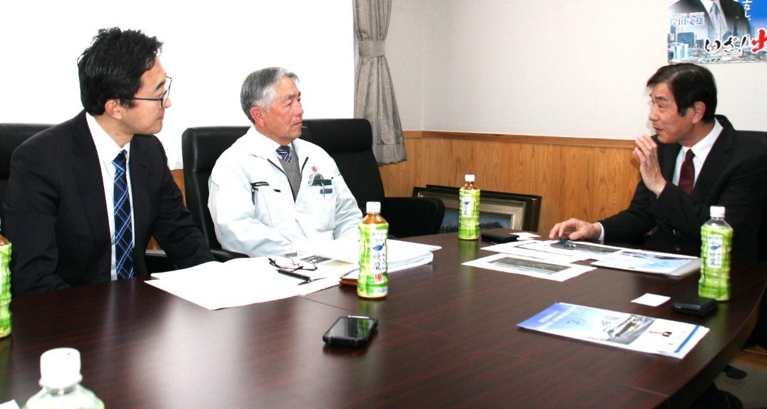 | 鈴木達夫理事長(右端)に話を伺う京極恒弘委員長(中央)と須山雄造副委員長 |